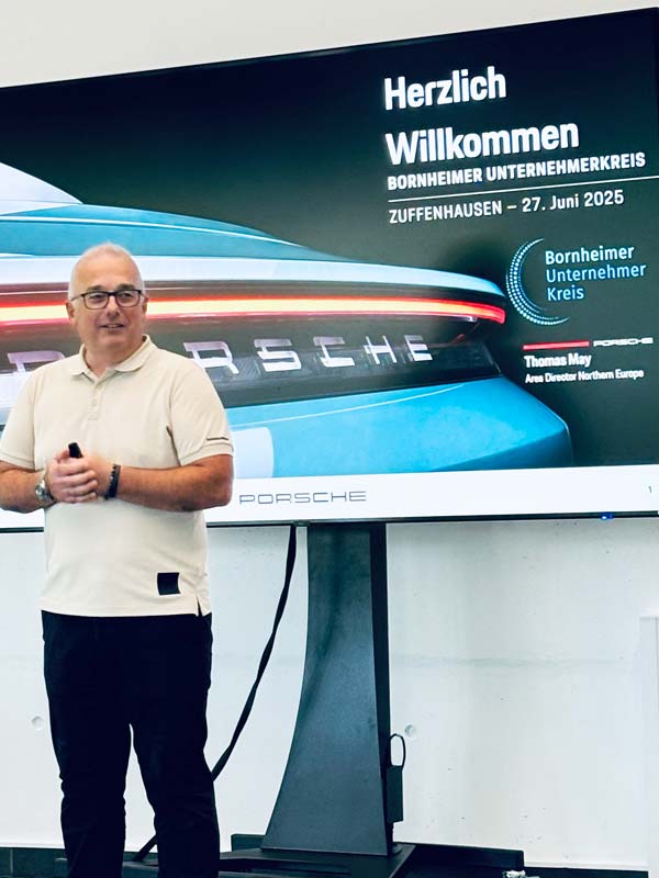 Nach einer Führung durch das Porsche-Museum empfing uns Thomas May, Direktor Nordeuropa bei Porsche, und erklärte die Chancen und Herausforderungen des Sportwagenherstellers. May, selbst geborener Bornheimer, machte auf eindrückliche Weise klar, wie Porsche seine führende Stellung als Sportwagenhersteller festigt und weiter ausbauen möchte. Aktuelle geopolitische Situationen, ein zögerlicher Automobilmarkt und unvorhersehbare Probleme, wie z. B. Zölle, fordern den Sportwagenhersteller heraus. Dies sieht das Unternehmen bekannt sportlich. May: „Wir wollen unsere Umsatzrendite von 14,1 auf 20 % in den nächsten Jahren steigern und das trotz aller Herausforderungen.“