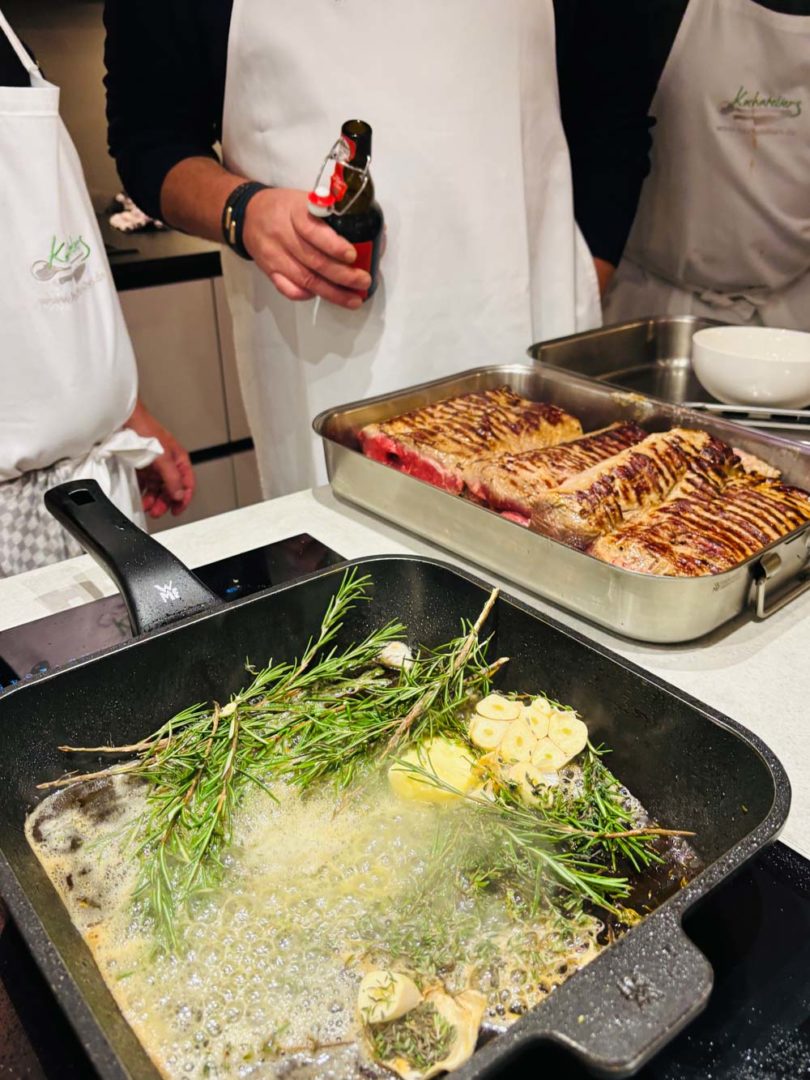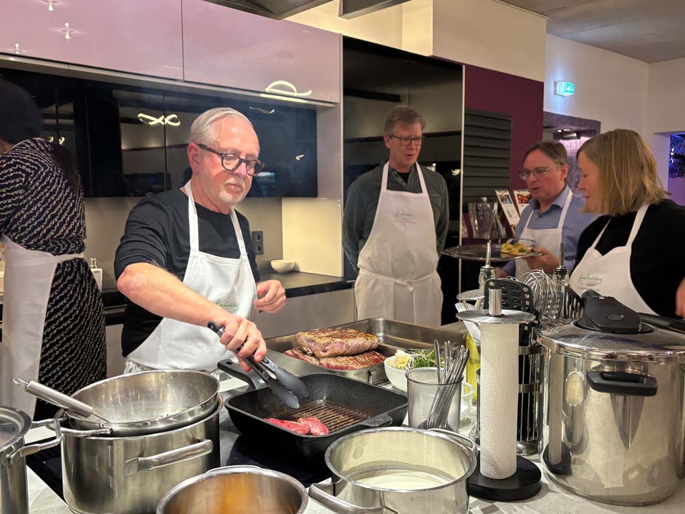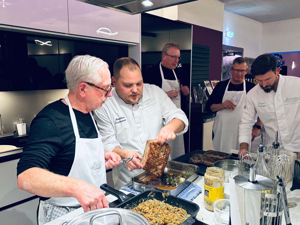 Die einzelnen Gänge waren köstlich und so mancher Amateurkoch schaute sich den einen oder anderen Kniff ab oder nahm so manche Raffinesse mit nach Hause. Der Mitmachabend endete in einem opulenten Essen und einem Glas Wein oder Bier. Neben dem Genießen kam das Netzwerken nicht zu kurz.